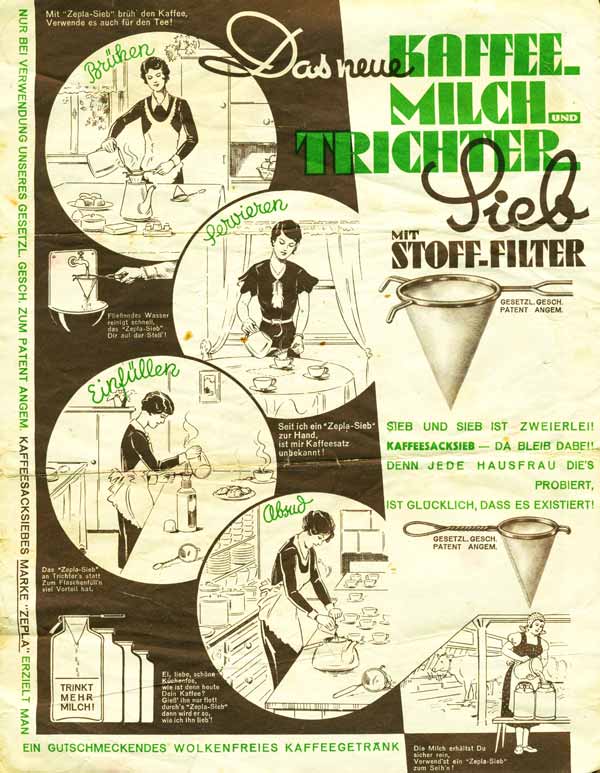 Nur bei Verwendung unseres gesetzl. gesch. zum Patent angem. Kaffeesacksiebes MARKE: "ZEPLA" erzielt man ein gutschmeckendes wolkenfreies Kaffeegetränk. Sieb und Sieb ist zweierlei! Kaffeesacksieb - da bleib dabei! Denn jede Hausfrau die´s probiert
